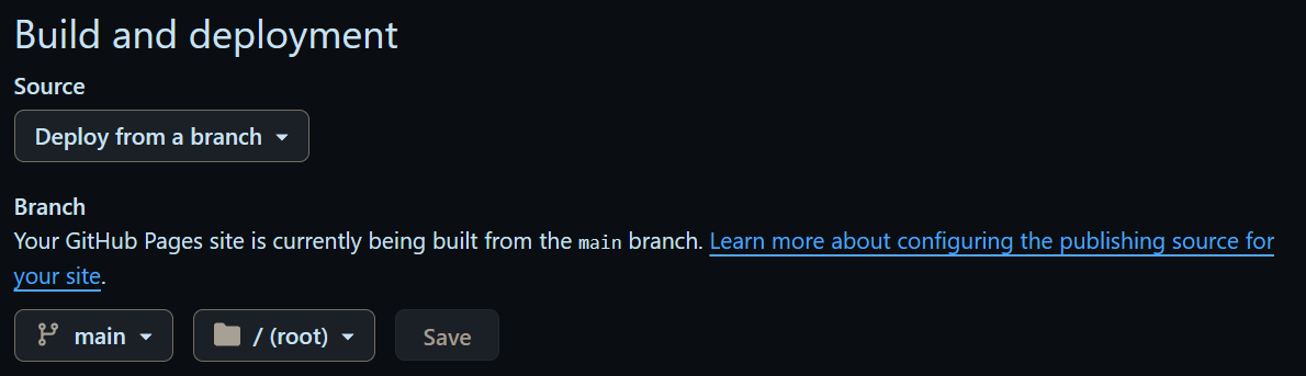 部署完成之后,在 Settings 中,左侧的 Pages 中,在 Build and depolyment 中如下设置,branch 中按照在 Hexo 中的设置设置成自己的就行。